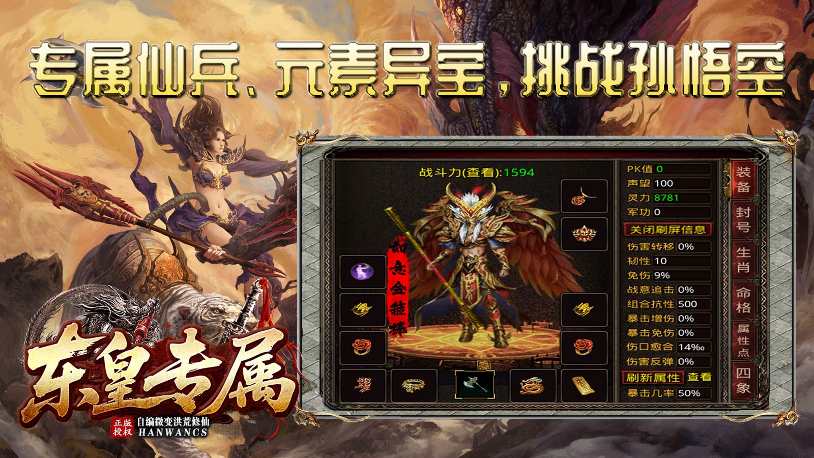 专属仙兵,元素异宝,挑战孙悟空。